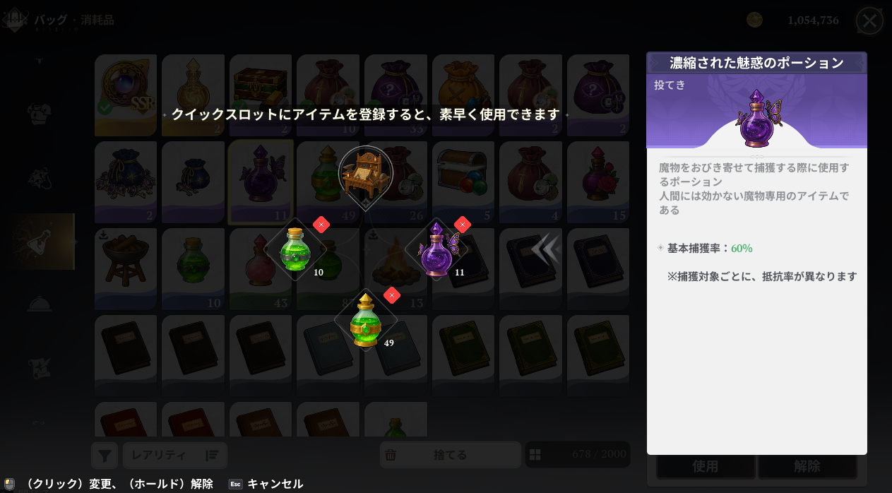 高純度の魅惑のポーションでは捕獲率が0%です。なのでフォレストゴーレムの捕獲前に濃縮された魅惑のポーションを用意しましょう。ミッション報酬でも入手できますが運が悪いと足りないかも。その場合は以下を参考に作成してみてください。
