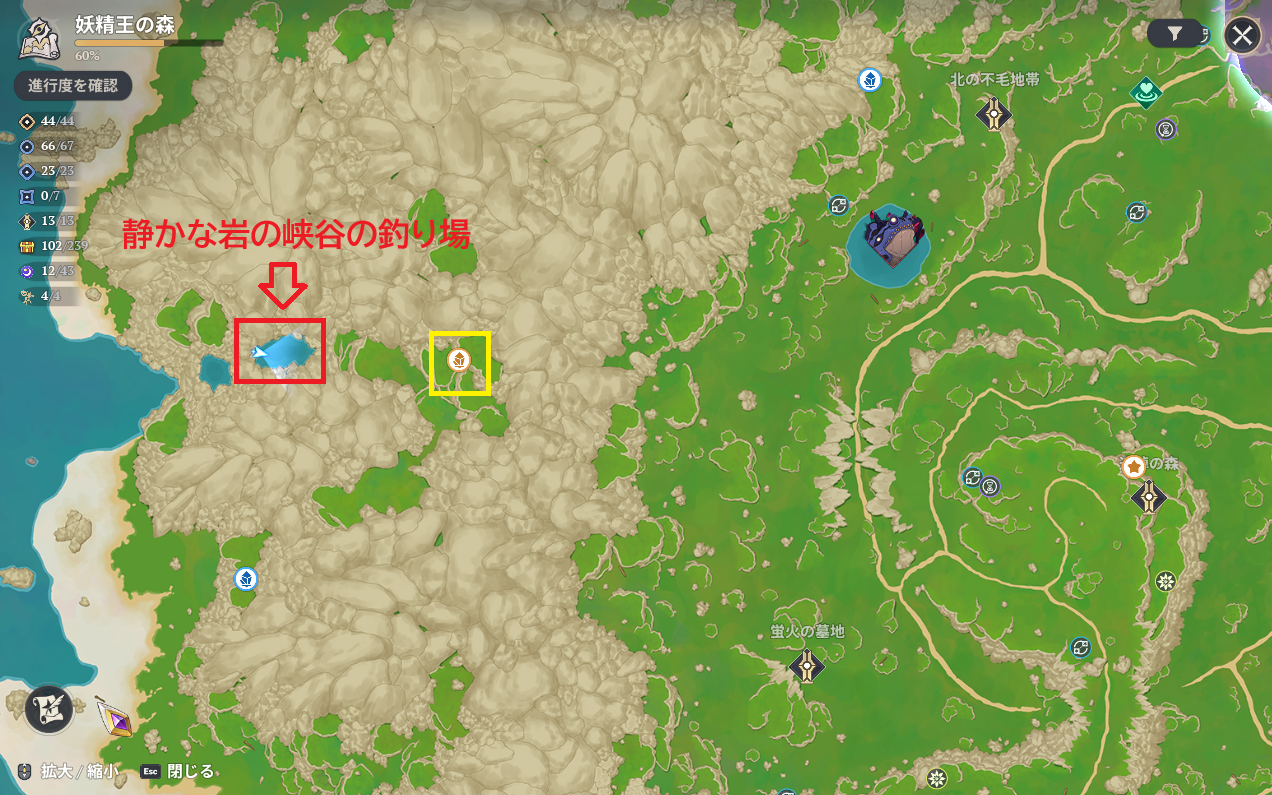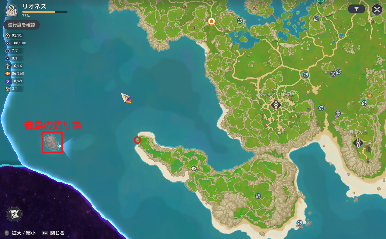 七つの大罪Origin(ナナオリ)のホークパスシーズンミッション「岩島の釣り場」と「静かな岩の峡谷の釣り場」の場所です。