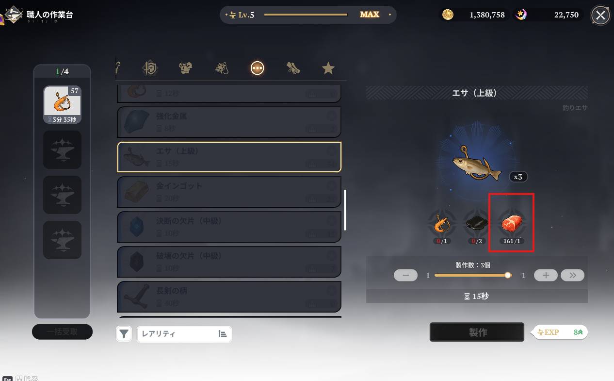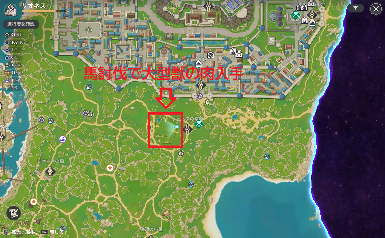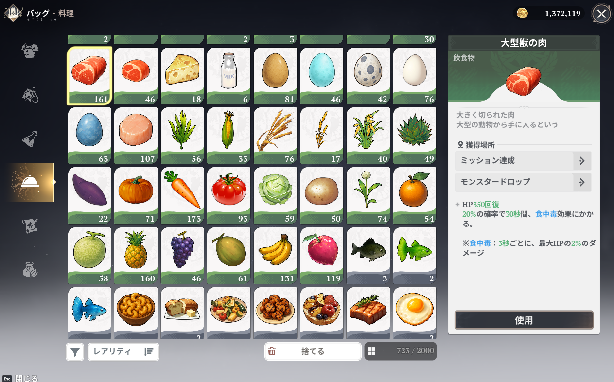 大型獣の肉は料理や釣りのエサ(上級)に使用します。