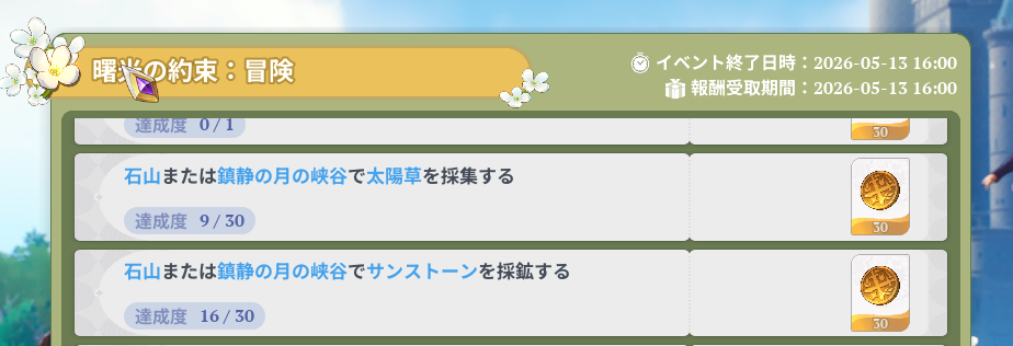 七つの大罪Origin(ナナオリ)のアップデート記念イベント太陽ミッション【曙光の約束:冒険】の「石山または鎮静の月の峡谷」で太陽草を採集、サンストーンを採鉱の場所です。
