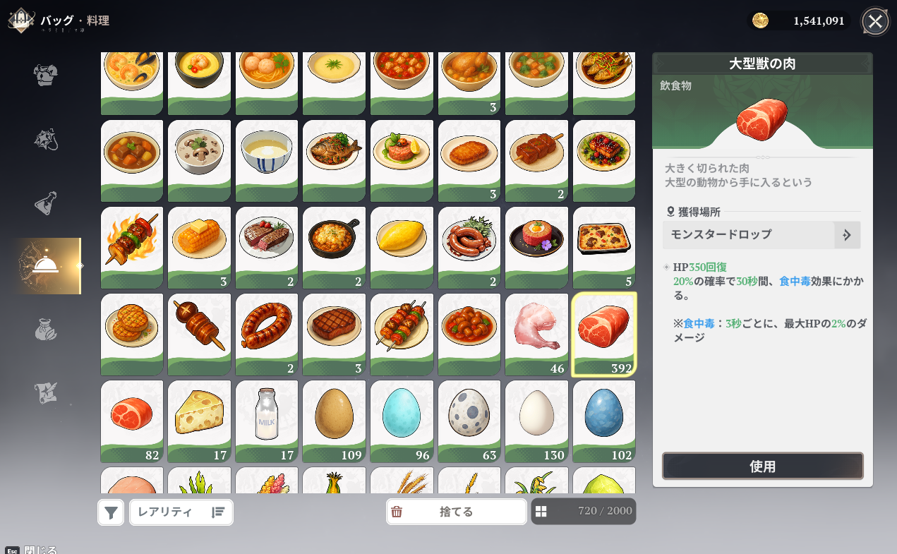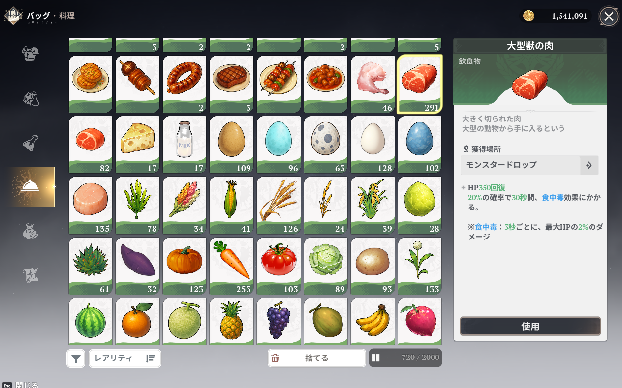 大型獣の肉は料理や釣りのエサ(上級)に使用します。しばらくは暴竜タイラントドラゴンホークで冒険しとこっと。