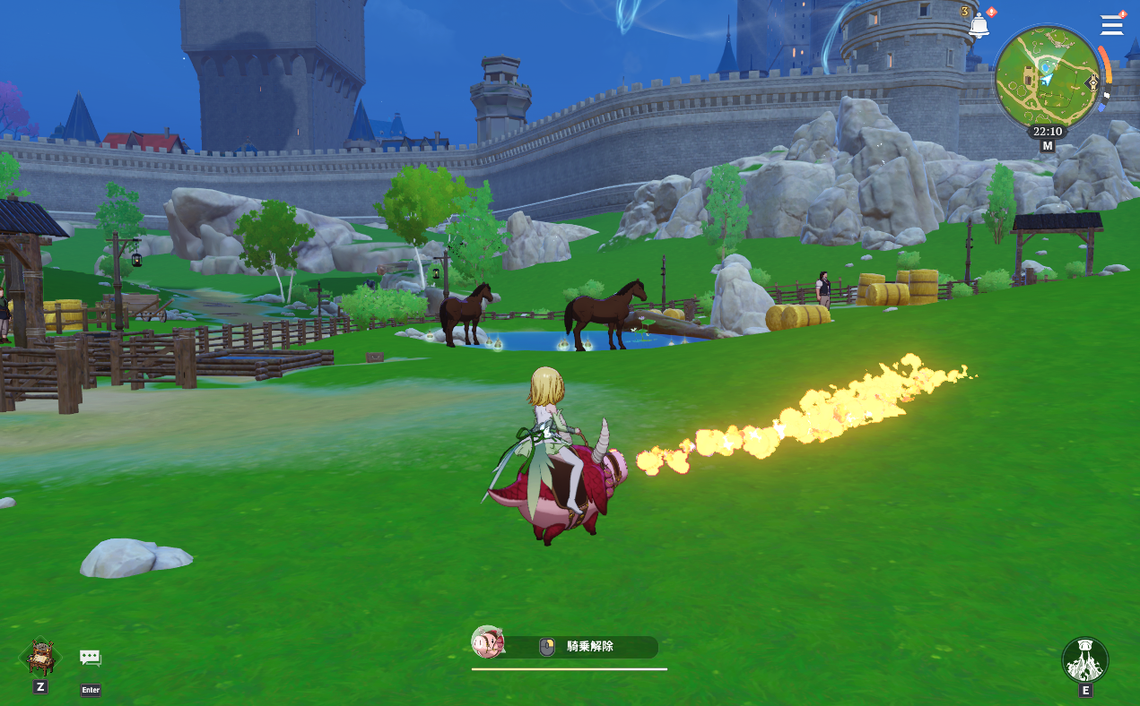 今回は暴竜タイラントドラゴンホークに火を吹いてもらい馬大量狩りです!ドロップアイテムを拾ってくれるようにペット「懐いた水の精霊」を出しておくのとペットに乗騎でもアイテムを拾ってくれますが、「懐いた水の精霊」を持っていない場合は乱獲した後に拾いに行きましょう。