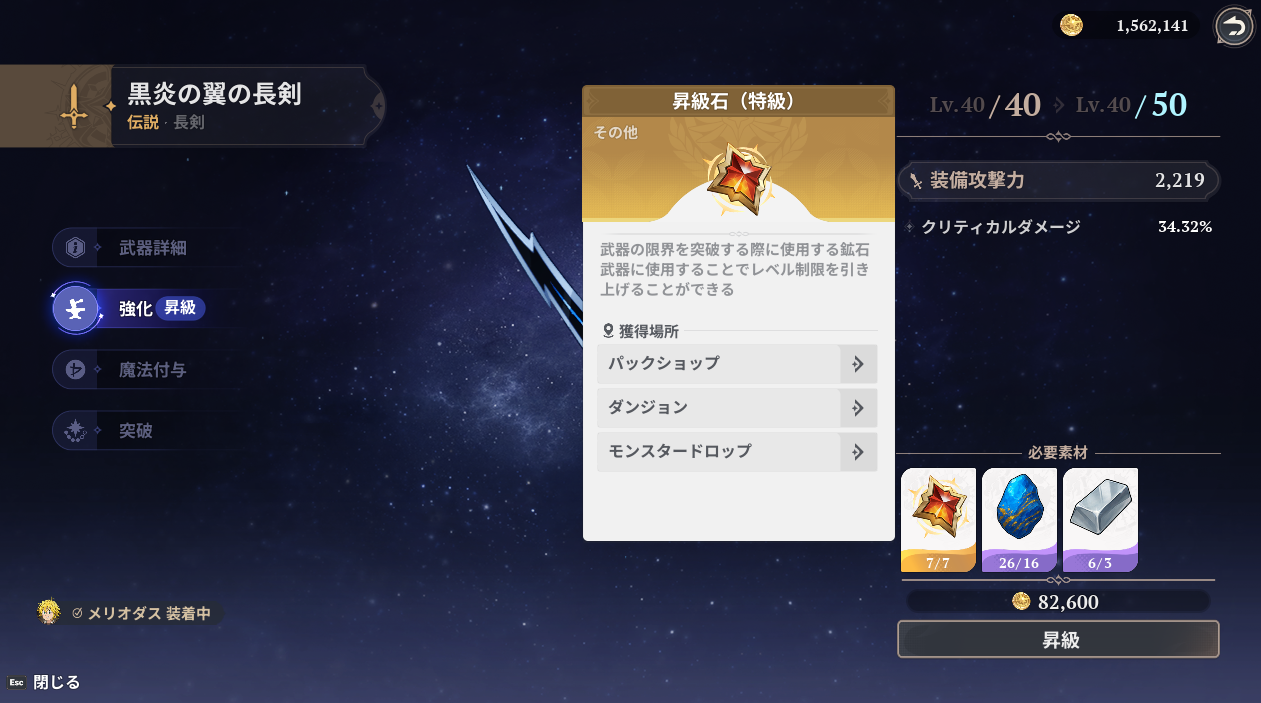 七つの大罪Origin(ナナオリ)の武器のレベル41~50を解放するのに必要な強化素材「昇級石(特級