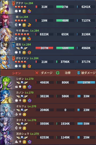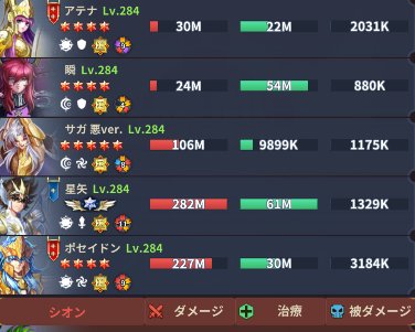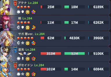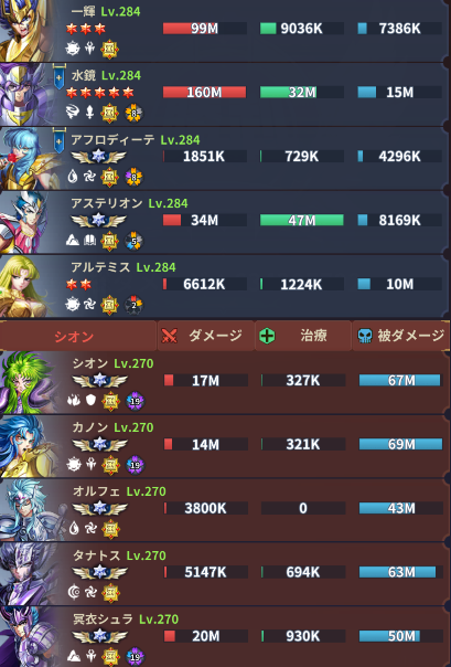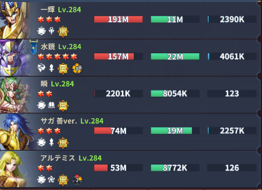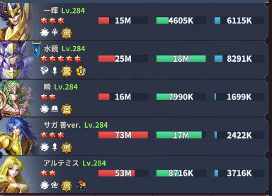 編成。星矢、一輝、杯座水鏡がけっこう稼いでいます。月の女神アルテミスも使用してみました。