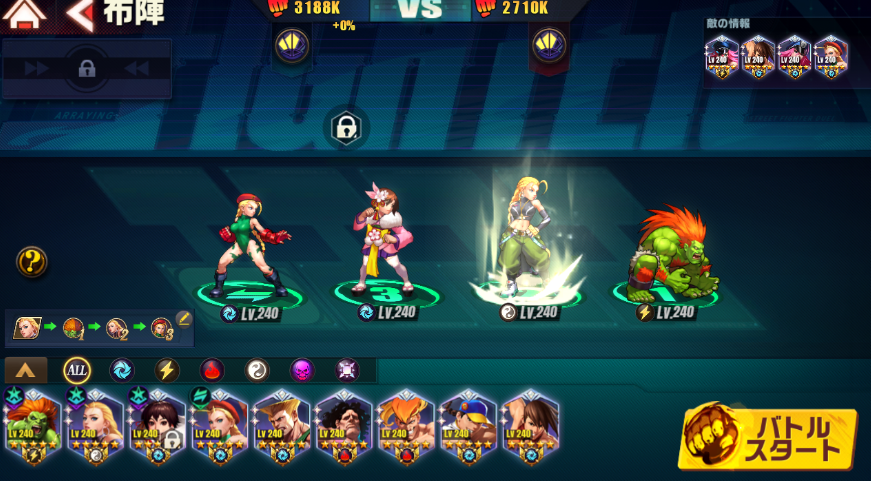 ![]() | 「錦飾りさくら」疾風テクノロジーアシスト暗殺補足SPD:104(40位)必殺:桜満開【強化】/自身の頭上に20秒間持続する桜の枝を召喚する。桜の枝は2秒ごとに下にいる味方ファイターに花霞を1スタック付与する。 桜の枝が既に存在している場合、代わりに味方全体に花霞を8スタック付与する。2桜花乱舞【治療】/自身の周りに20秒間舞い続ける桜の花びらを召喚する。桜の花びらは2秒ごとに範囲内の味方ファイターのHPを錦飾りさくらの攻撃力の20%分回復し、範囲内の敵ファイターに攻撃力の20%のダメージを与える。 桜の花びらが既に存在している場合、代わりに味方全体のHPを錦飾りさくらの攻撃力の180%分回復する。3八重桜波動拳【範囲】/力を溜めて波動拳を放つ。ターゲットへの命中後、小範囲内の敵全体に攻撃力の375%のダメージを与える。発動時、自身に付与されている花霞4スタックにつき、このスキルの発動中に攻撃力が6%アップする。早生桜/自身の花霞獲得時、6秒間治療率が2%、ダメージ軽減率が1%アップする。最大で20スタックまで。 | 「錦飾りさくら」「戦意/さくらのリボン」トキメキ:花霞の持続時間が4秒間まで延長される。[+5解放]【サポートスキル】ファイターがサポート枠にいる時に効果が発動する。被サポートファイターの先発での出撃時、バト終了時まで治療率が12%、ダメージ軽減率が6%アップする。[+10解放]【桜花乱舞】での味方の回復後の8秒間、ターゲットのダメージ軽減率が15%アップする。[20解放]花雷の持続時間が6秒間まで延長される。[+30解放]【桜花乱舞】の桜の花びらの範囲が大きく拡大され、ダメージ倍率が50%アップする。 |