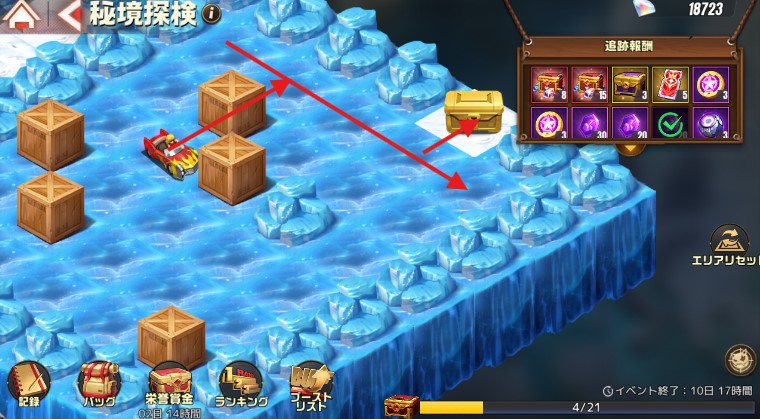 オレンジと緑のレバーを引くとゲートが解放できます。黄色の矢印で奥の報酬を獲得。